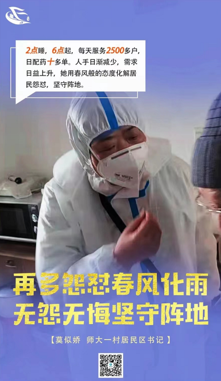 这是师大一村封闭的第12天,自4月1日浦西静态化封控管理以来,莫似娇一直住在居委会,期间曾连续8天没洗过澡。小区常住2500户,80岁以上的居民有500多人,不少子女不在身边。莫似娇为解决老人们的配餐、配药问题忙得脚不沾地。这十多天来她与居委干部、社工们2点睡,6点起,不停歇地协助核酸检测、解决居民们配餐就医等问题。