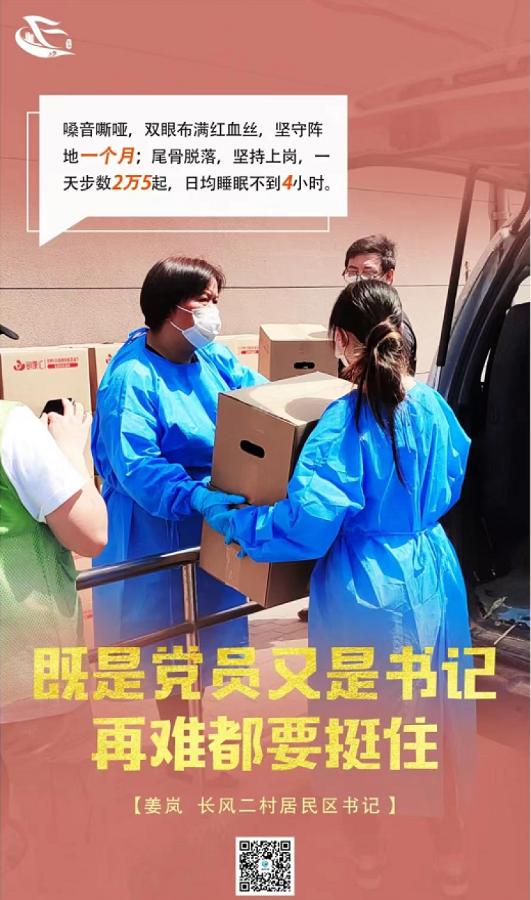 姜岚是长风二村书记、主任一肩挑的老将,3月底在工作中不慎摔了一跤,导致尾骨脱落。本应在家好好修养的她,接到小区封控任务后,不顾自身身体安危,依旧坚持上岗,冲锋在前,统筹协调,发挥出社区“中流砥柱”的作用,用尽责和担当给了老百姓及居委干部一颗“战疫必胜”的定心丸。