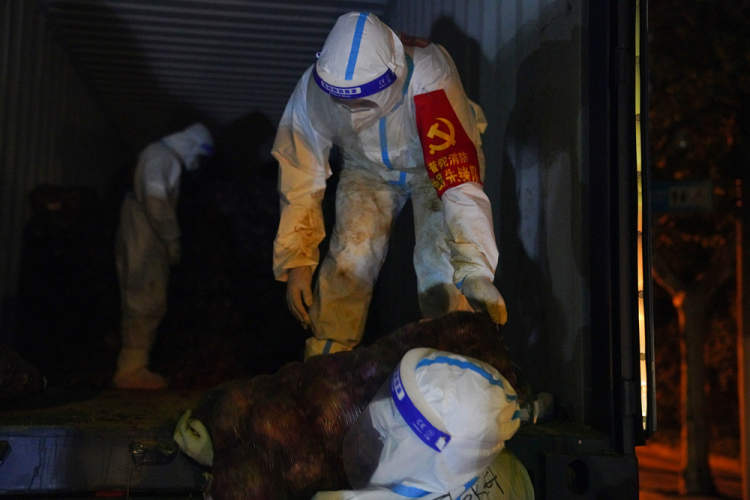 4月7日深夜,一批外省援助物资到达后,涉疫分队的消防员们穿好防护服,变身“搬运工”,执行紧急搬运任务。近4个小时,他们累计搬运蔬菜等各类生活物资30余吨。忙完后,胡华北和队友们身上的白色防护服,都沾满了泥土,白手套也变成了黑手套。