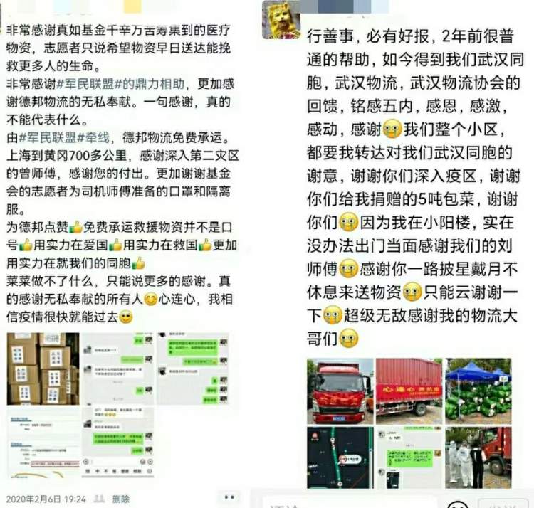 “当时武汉已经封城,周边物流也都停了,没有车辆肯去。我找到了军民融合应急物流联盟,他们的秘书长帮忙联系了德邦物流。得知这是一批赈灾物资,德邦物流决定免费帮忙运送,让我们非常感动。”蔡女士说。