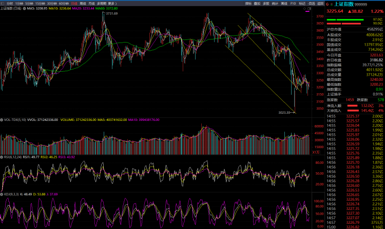 今天沪深两市双双高开,盘中汽车整车板块走强,中通客车涨停,中集车辆、亚星客车、广汽集团、东风汽车、海马汽车、长城汽车等跟涨;中药板块异动,龙津药业涨停,精华制药、汉森制药、众生药业、太龙药业等跟涨。午后煤炭、新冠检测、白酒、地产涨幅居前,两市85只个股涨停,全天成交额8700亿元。最后沪市上涨1.22%,报收3225点;创业板微跌。全天成交额8700亿元,呈缩量反弹状。