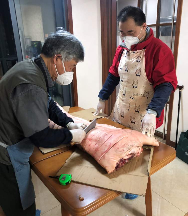 水果小哥就到市场上去,问好价格、拍照发图给我。这时我已经知道,现在市场上的猪肉基本都是半扇起卖的,能给你劈开、分装的很少。那这个猪肉到了我怎么处理呢?我就在小区群里问了一声,有人回复说自己的父亲是以前海军军医大学临床应用解剖学的教授,可以来试试帮我分割。这个问题解决了,那我就放心让小哥帮我去买猪肉了。