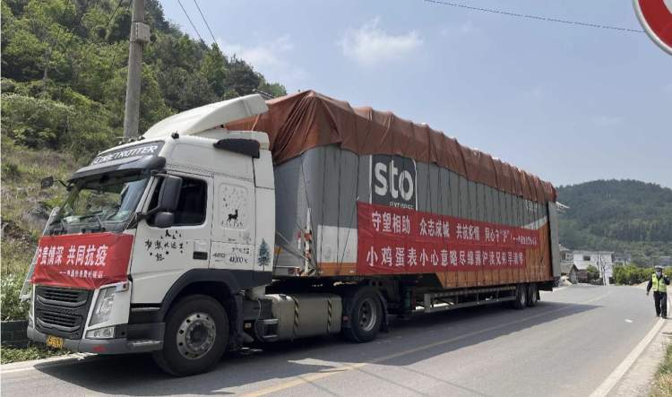 一辆申通快递物流车驶入上海市闵行区虹桥镇人民政府,车上满载的是从贵州远道而来捐赠给当地居民的350箱共计15万枚鸡蛋。