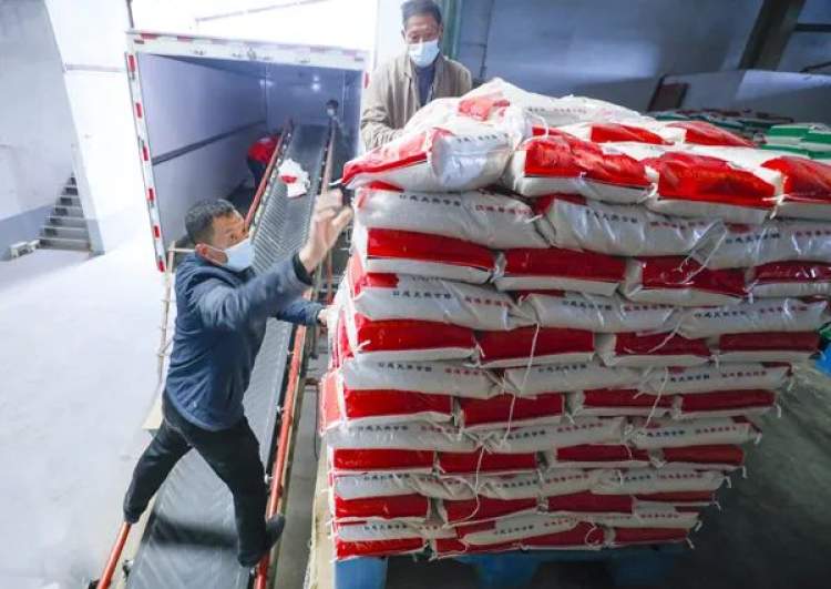 东台工作人员正在搬运大米