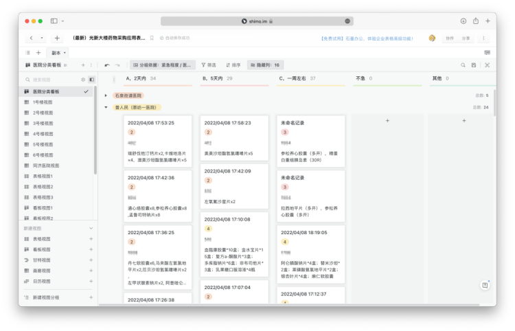 首先要选择合适的工具,迅速收集居民反馈。“考虑到我们社区老龄化很严重,大部分人都不会填写表格,我就想到用石墨文档,做成问卷表单形式,让居民勾选。”郑健玮解释称,这些收集来的问卷数据可以在后台直接导成想要的多维表格,而不只有单一的统计结果,这就大大方便了运力的统一调配。“比方说,我要看哪些人要在区人民医院配药,我只需要在后台勾选医院视图,就可以看到对应的列表数据。居委根据这份名单,直接派一辆车去人民医院,小半天就可以完成配药了。”