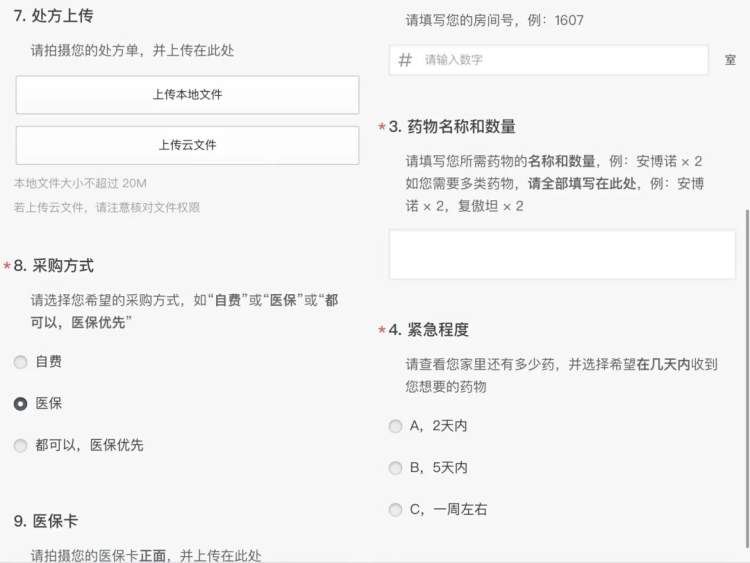 其次要统一信息收集格式,一次性统计整个小区6栋楼近4000位居民的配药需求、药品类型、年龄层、指定医院、紧急程度等信息。“一开始我们觉得需要上传医保卡照片、身份证照片,林林总总加起来要填18个问题,后来发现很多都不需要。” 郑健玮介绍称,问卷经历过2次迭代,精简了信息采集,“年纪大的都喜欢把药盒子剪下来放在医保卡里,连药品照片也不要传了。”据悉,目前问卷填写的平均耗时,从6分钟/次,提速到55秒/次。