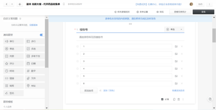 记者尝试后发现,进入“代配药申请表单(石墨文档)”页面后,点击“问卷设置和数据查看”,创建副本并在已有模板下按需改动楼栋、目标医院等模块,半小时内便可完成社区“定制化”版本表单,构建专属代配药需求数据库。