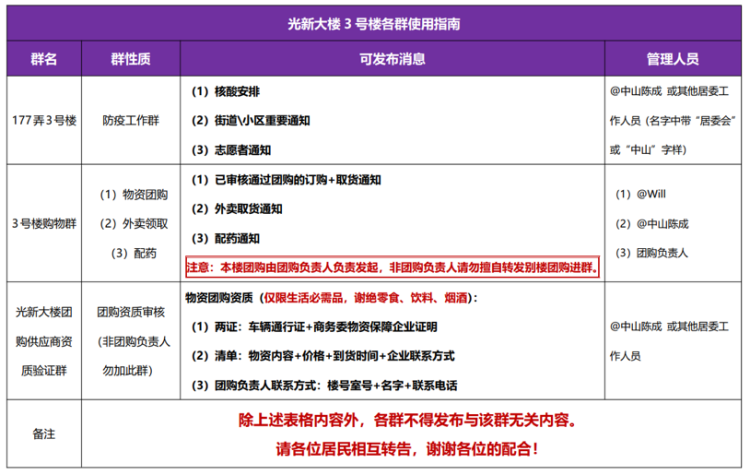 对此,陈成组建了资质验证群和骨干购物群。团长先在资质群内提供供应商的上海防疫保障证明、物流运输证、核酸证明等。团购工作组审核通过后,将该渠道纳入总清单里,并根据居民需求制定方案,再由各楼栋的登记统计组告知全体居民,确保所有人知晓率100%。“比方说今天整个小区居民都可以买到包子,第二天都能买到肉,第三天都能买到蔬菜或者水果。”陈成介绍说,每天团2—3样,如此循环往复保证居民食物链不断供。