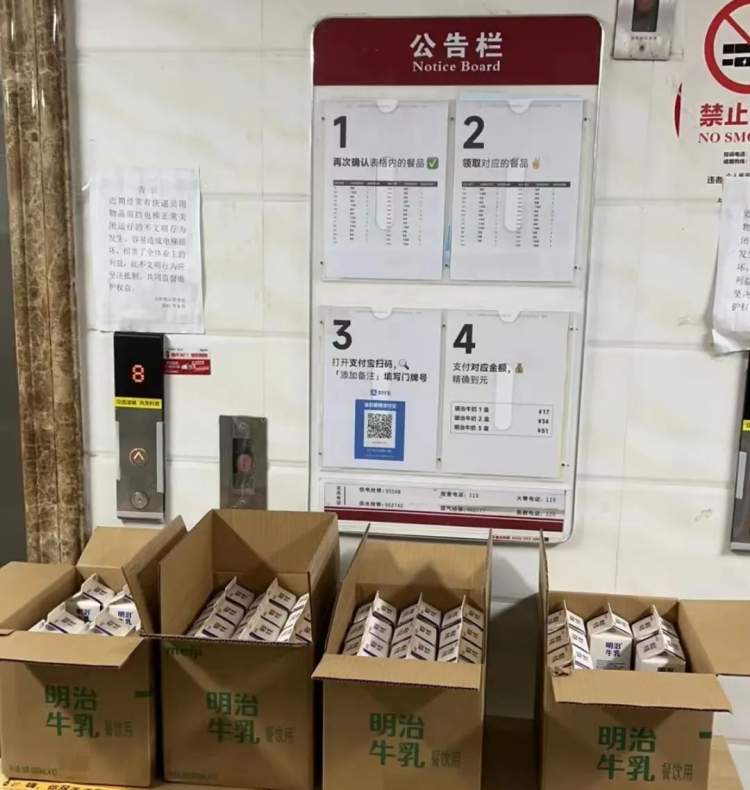 无接触式领取团购物资:业主们分层错时前往一楼,根据公告栏上步骤自觉领取