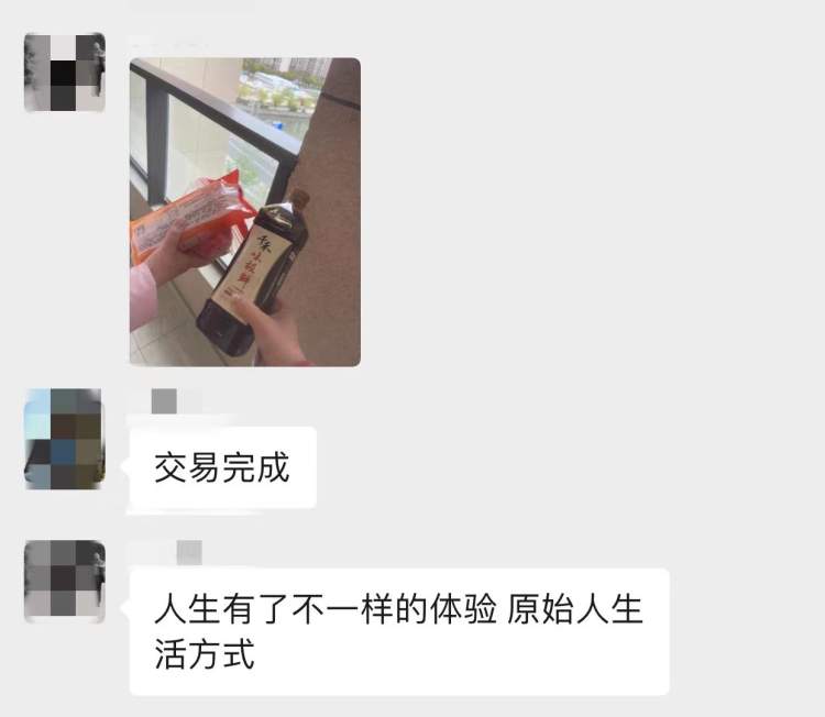 之前我在群里问家里酱油快没了,能不能‘零拷’一点,结果楼下就出现了一瓶1升装的。我发现有些阿姐、阿姨真的是‘深藏不露’,物资储备充足几乎要啥有啥,年轻人们不好意思了想要花钱购买,他们都不收。