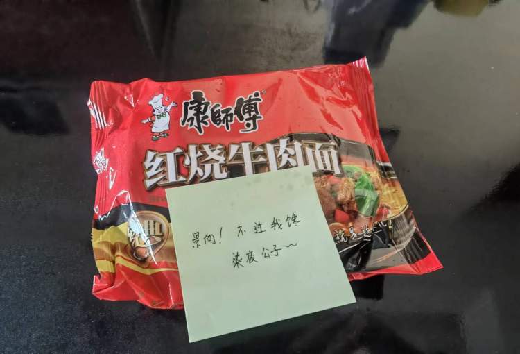 听一首名为《吃泡面》的歌听饿了,家住新虹街道的小美在楼组群里随意提了一句,没一会儿就听到了门铃响了。出去一瞧,门外只有一包红烧牛肉面,上面有一张小小的便签条。