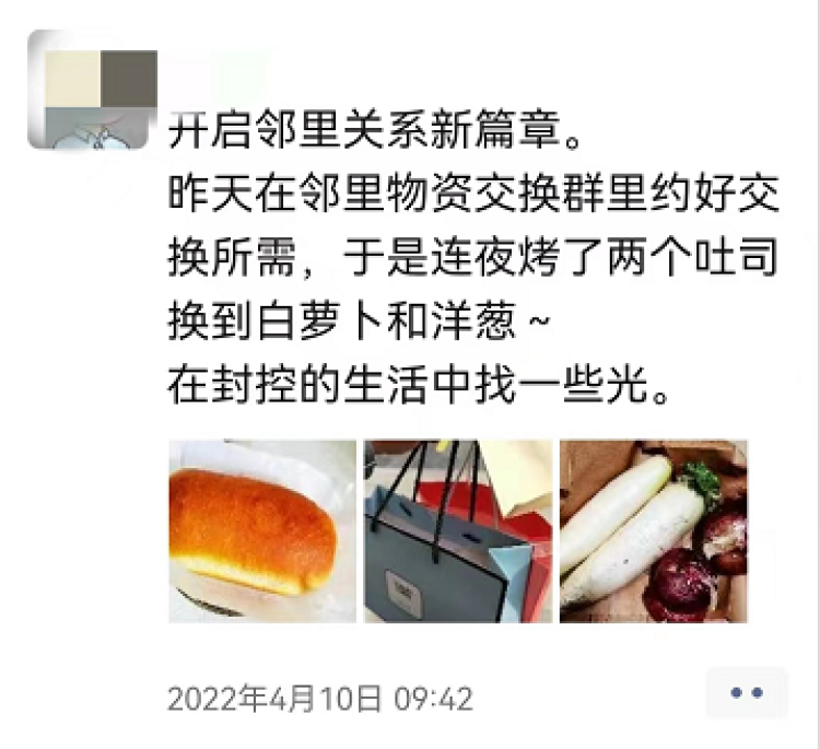 来自邻里之间无条件的善意,和最原始的“以物换物”带来的安全感,让大家能够更积极、更乐观地面对封控期间的每一天。