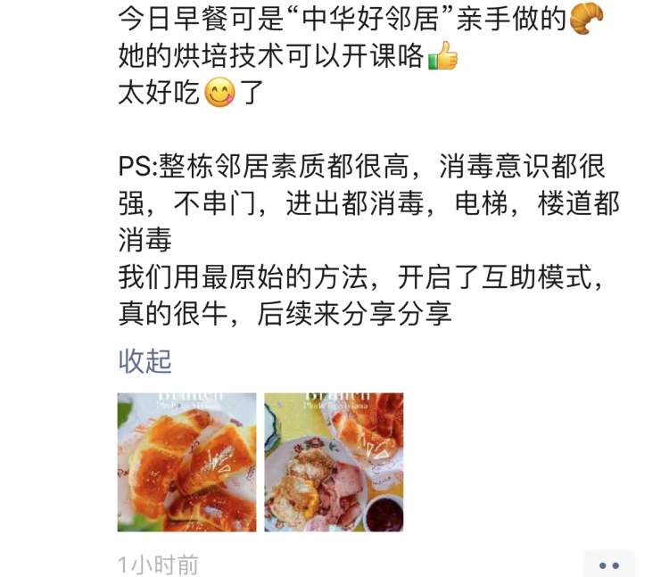 昨天下午,家住徐汇区田林街道的吴先生在微信群聊中发了一张面包配咖啡的图片解释说,自己做了一条吐司,用半条和邻居换来了一杯咖啡,如此一来,两户人家都拥有了完美的下午茶。
