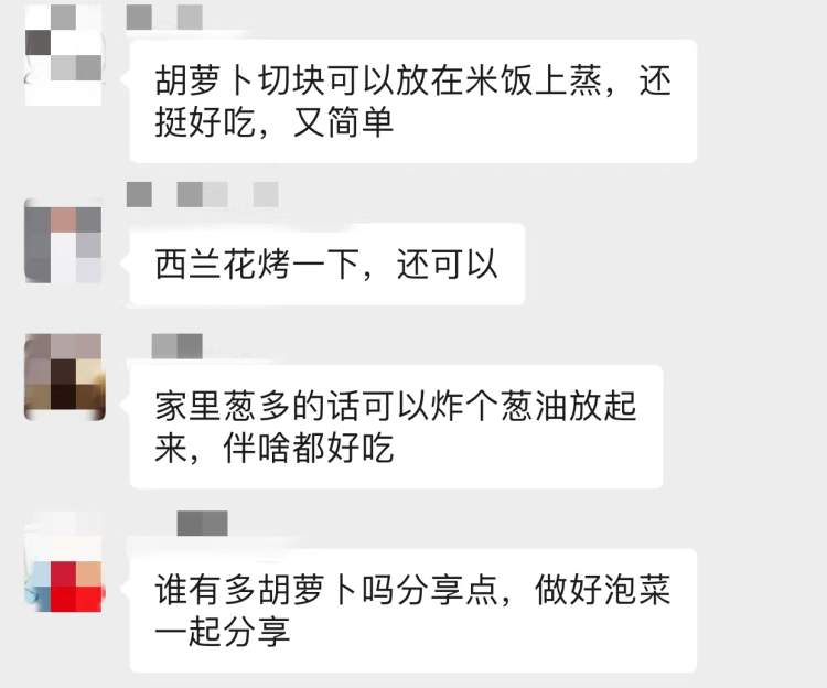 大家团购的蔬菜包里萝卜过多,还有居民挺身而出收集红白萝卜,打算自制成泡菜再一同分享。