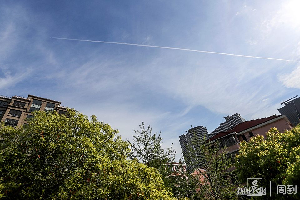4月10日中午,一架飞机在湛蓝的天空中划出一道美丽的弧线。