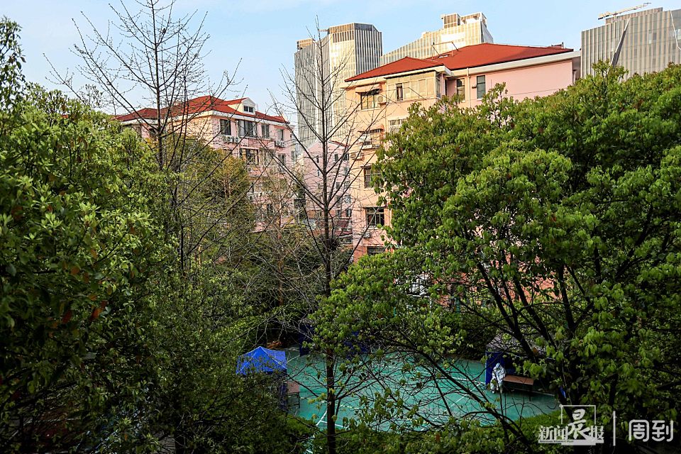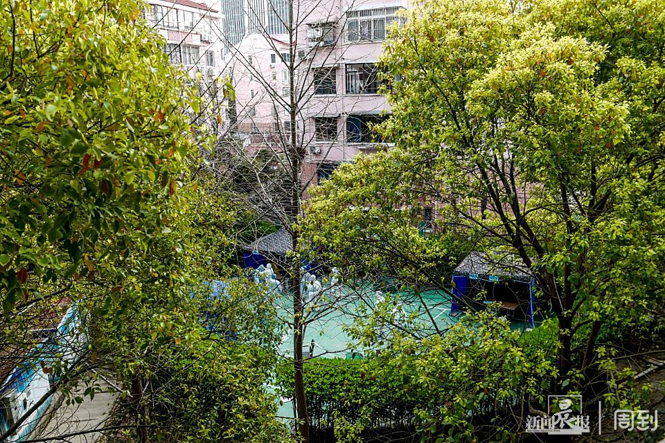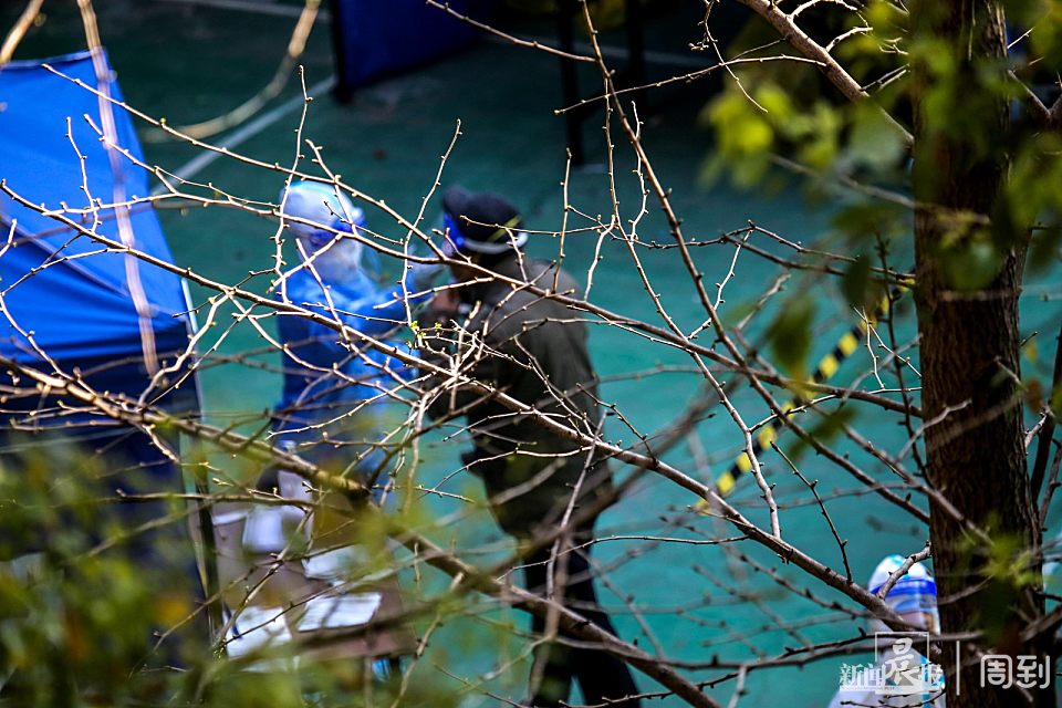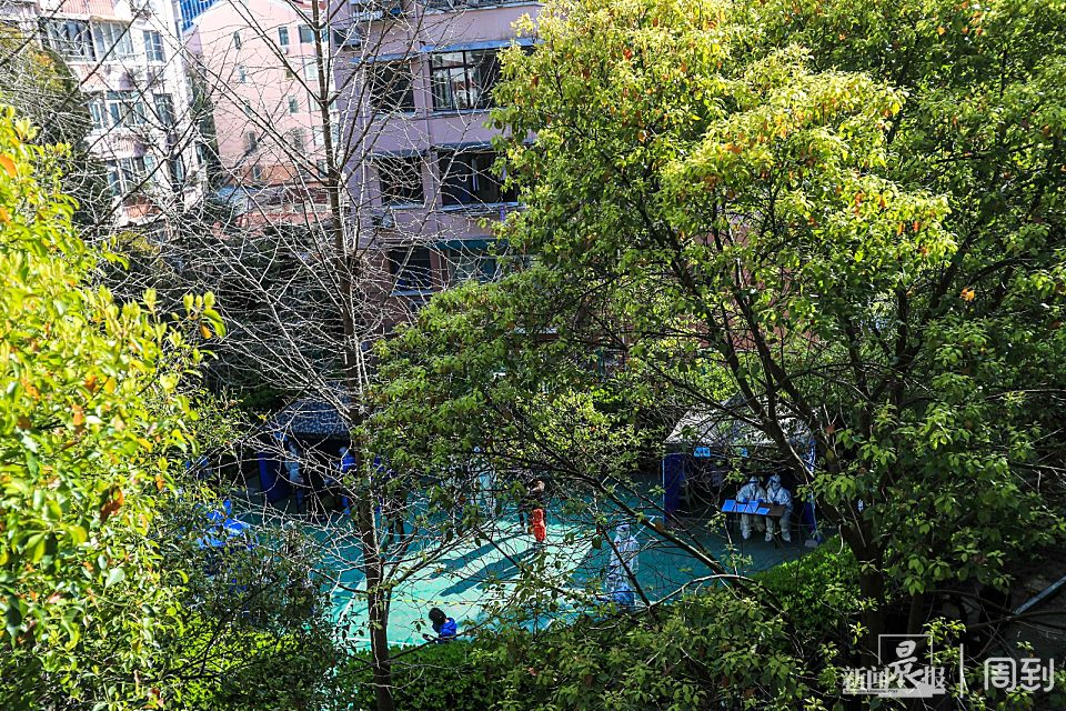 4月4日,阳光穿过树叶间的空隙,一缕缕地照射进小区,“大白”们引导居民有序间隔排队,静静地完成检测。