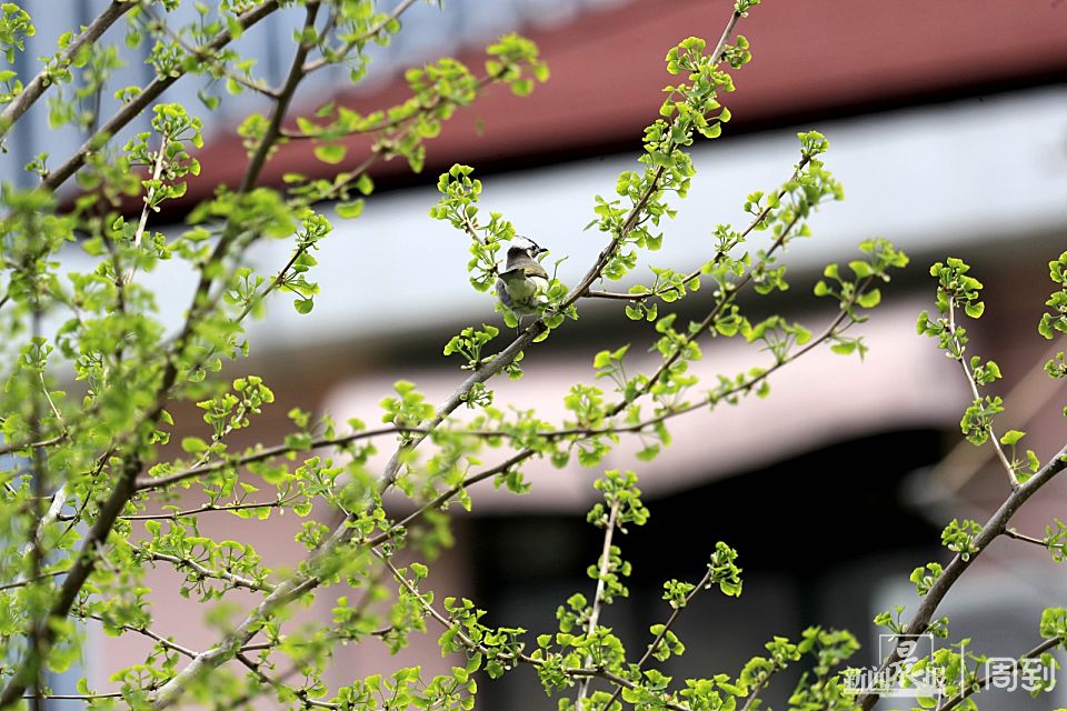 4月8日,光秃秃的银杏树枝上长出了一个个绿苞,一只白头翁在欢快鸣唱。