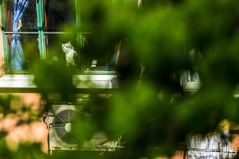 4月7日,树叶背后一户人家的一只猫咪趴在窗户上四处张望着。