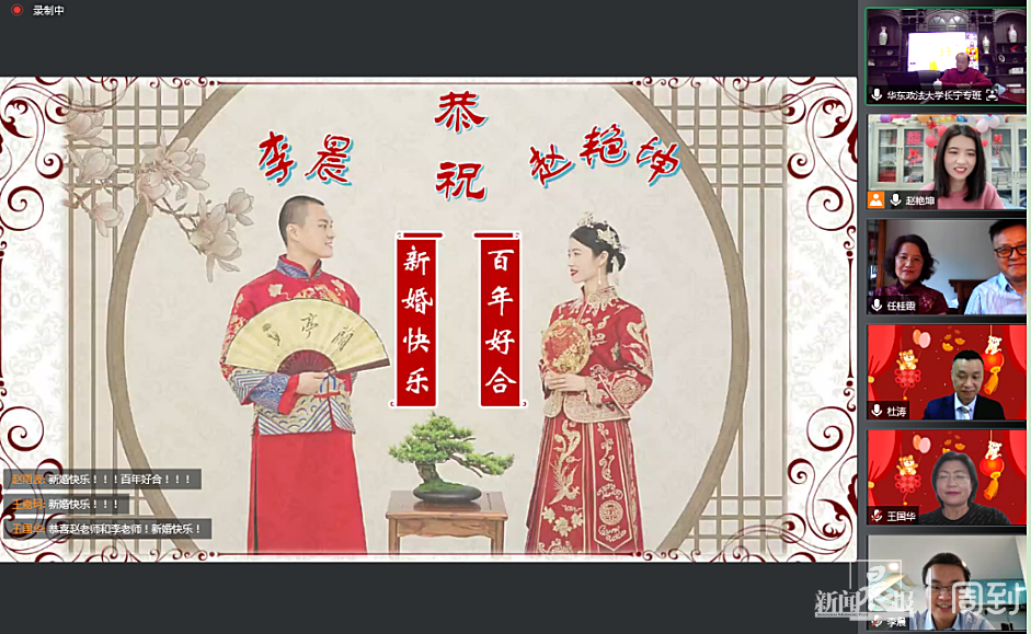 五一前夕,华东政法大学为举办了一场“云端婚礼”,新娘赵艳坤是华政国际法学院的青年教师,新郎是同济大学材料学院的青年学者李晨。