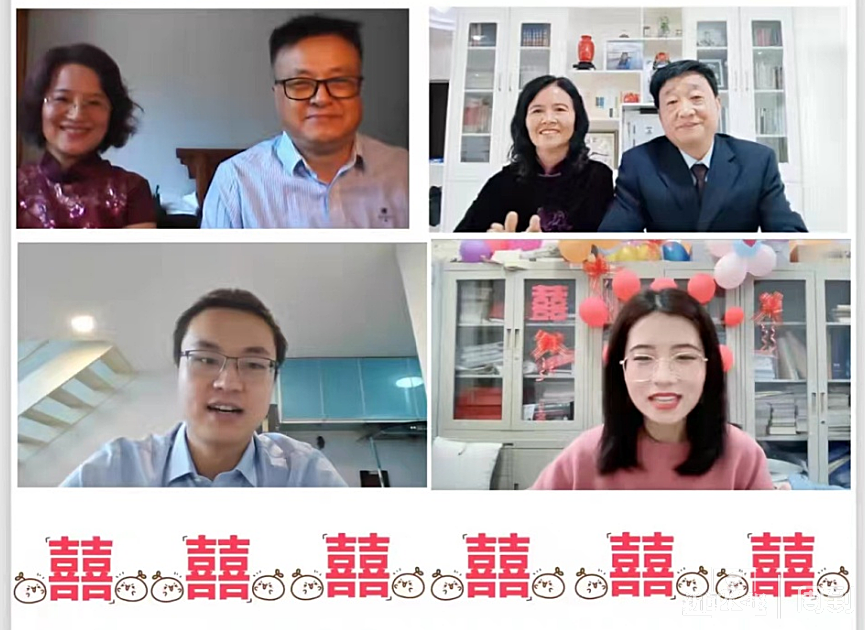 在大家的见证下,这对新人举行了“云”拜堂仪式。新娘、新郎的父母及新娘的妹妹等亲友分别在河南、辽宁送上了祝福。