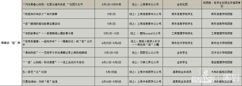社团文化节、防疫知识竞赛、抗疫心理故事分享、战疫云打卡、漫说防疫······疫情防控工作仍在继续,上商团持续动员广大青年发挥专长、齐心抗疫,为抗疫贡献青春力量。