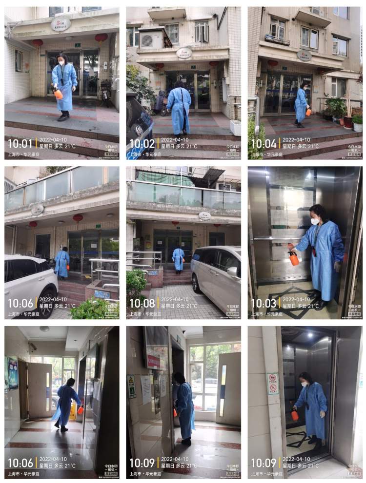 物资及楼栋的消杀也是疫情防控中的重要一环,为了让居民更安心,物业团队利用休息时间在网上研究学习了环境消杀技巧,甚至还考取了消毒员资格证,同时向专业消杀人员请教针对不同环境下消毒液的浓度配比。这段时间,团队成员每天肩背沉重的消杀设备,穿戴全套防护装备,辗转于各个点位,对楼内门把手、楼道地面、电梯内外按钮以及小区门口快递货架等和人员接触的环境物体表面进行全面细致的消杀。