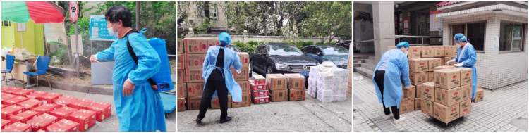 封控期间,小区内团购数量激增,团购物品从米、面、油、牛奶、鸡蛋到各种蔬菜水果,五花八门。物业全体员工上阵,把卸下的物资从大门运送至每栋楼下, 对封控楼栋和志愿者们一起分发到每户门口,并妥善照顾好小区独居老人。