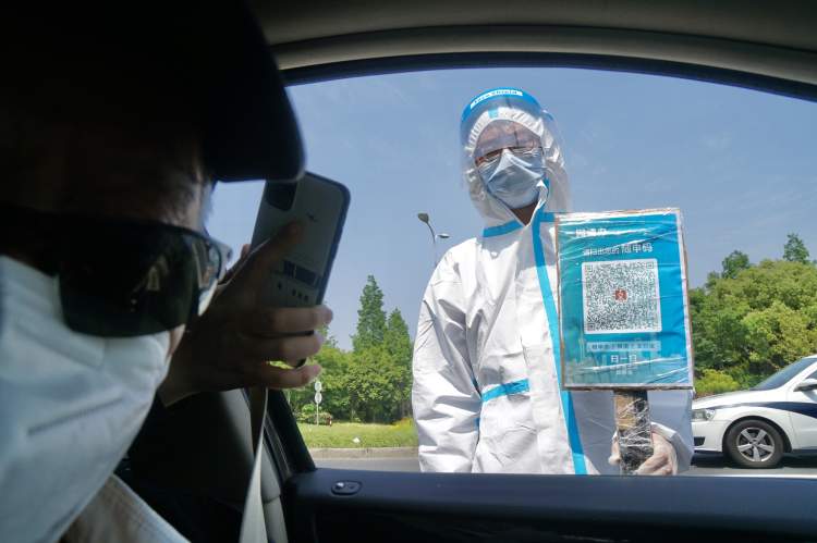 记者在前往百联金山购物中心的路上,途经杭州湾大道时遇到了临停检查,身着“大白”的工作人员便手举贴着场所码的木牌要求“扫一扫”。