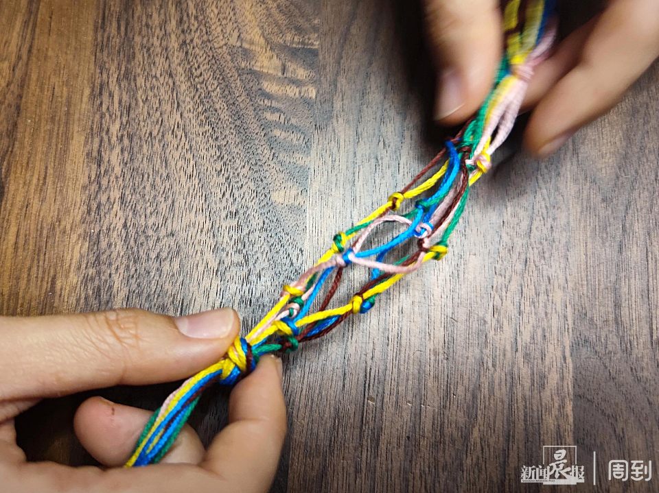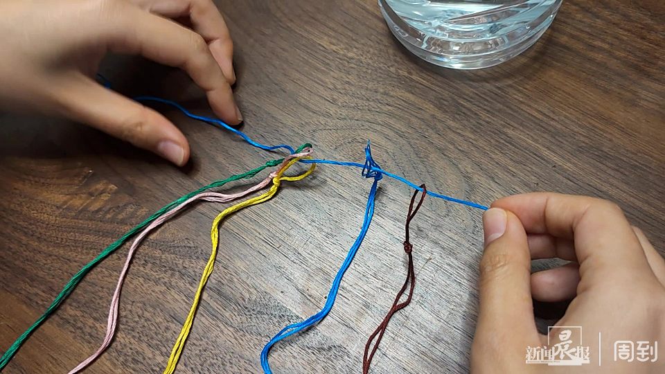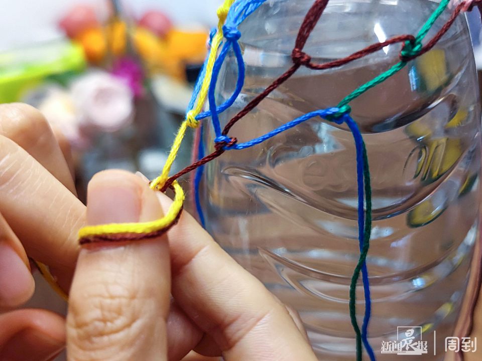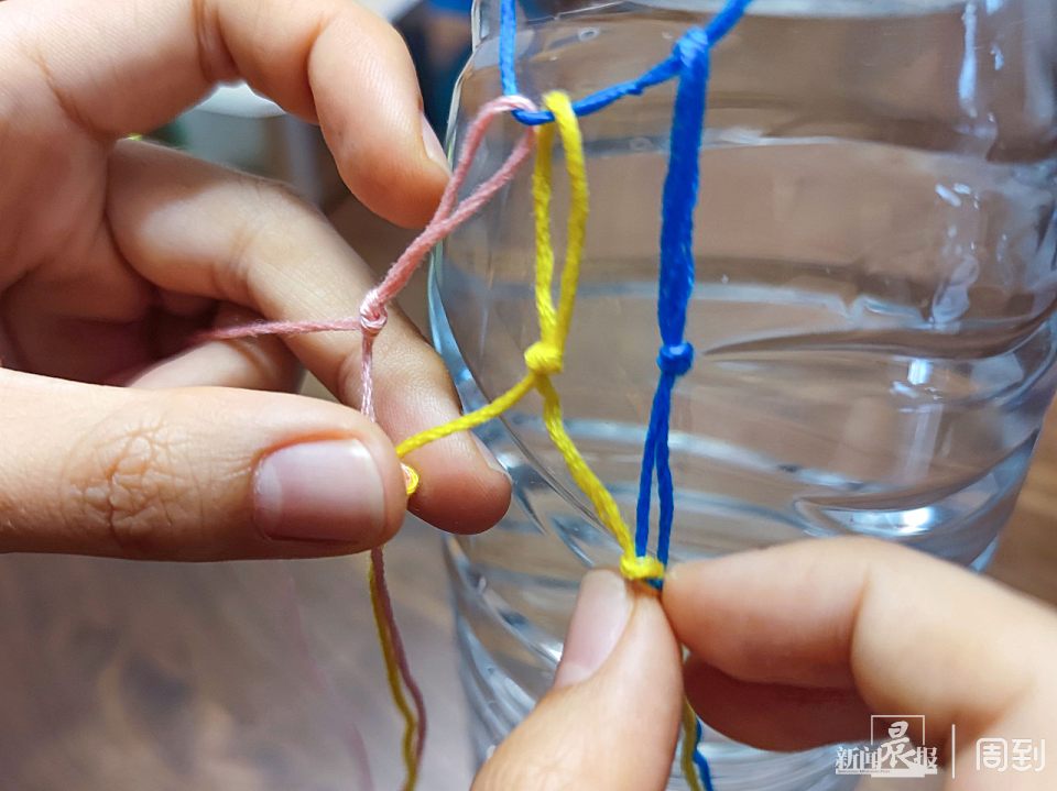 用一根线穿过5根绳子的圈圈里,套在矿泉水饼子上,打结固定,这样就可编织了。