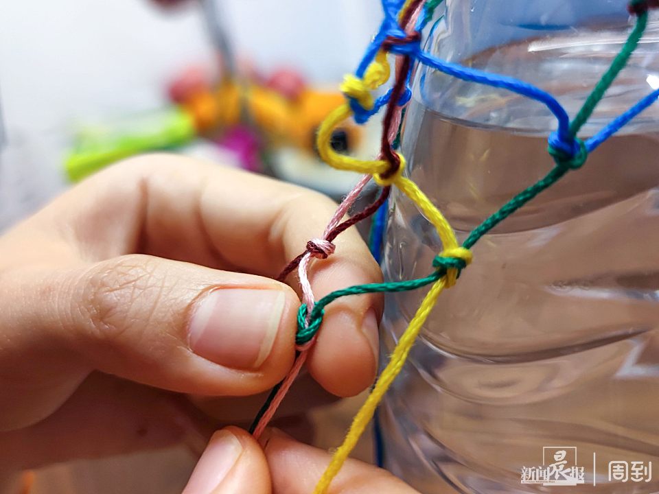 将打完节的蛋兜从瓶子上取下来,底部打个节,一个漂亮的蛋兜就完成了。。