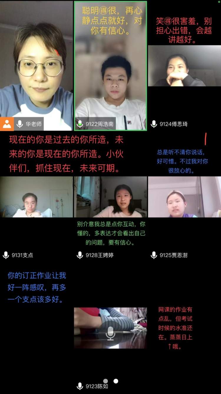 九年级的支点同学告诉周到君,在线上学习期间,每当遇到困难想要放弃的时候,她就会把导师华晓燕老师当初写在成团合照后面的那段话拿出来看一看,为自己打气加油。华老师在线上期间也会定期召集她指导的学生,陪他们聊聊最近开心或不开心的学习或生活琐事,还会为每一个孩子送上一句话,也许就是这样一点一滴的积累,学生面对困难的勇气也在一点一滴地增加。