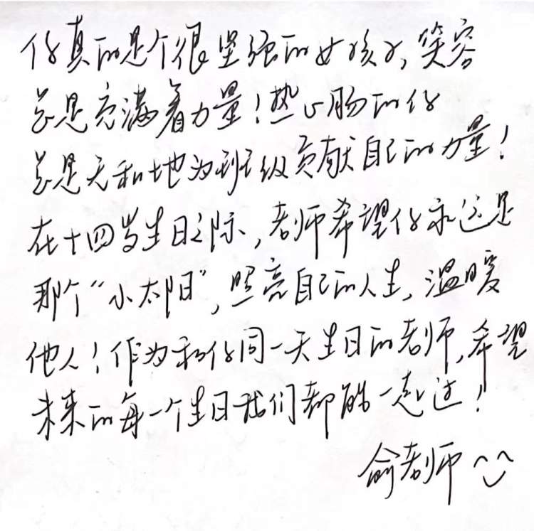 为了让她们的十四岁生日过得不孤单、更有意义,俞老师准备将相册里保存着的与此学生有关的视频和照片制作成记录她这两年成长点滴的vlog,送给她作为十四岁生日的礼物。“翻开相册,一张张照片里都是她乐观的笑容,希望她看到vlog后,能够继续以这种乐观的心态去面对日后可能的挑战”,俞老师说。