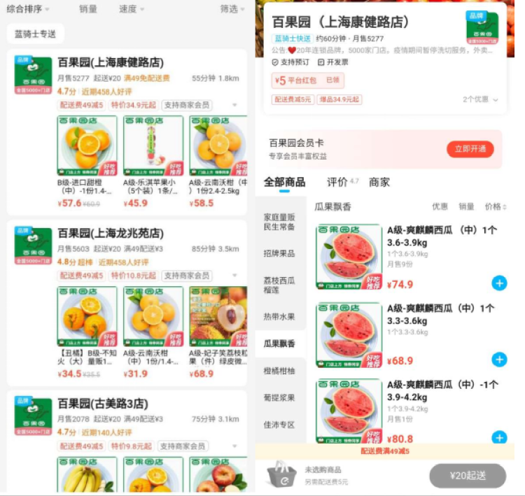 5月3日,家住徐汇区康健街道的王阿婆没想到,家里的大孙子吃上大西瓜的心愿这么快就得到满足。身处管控区的她,此前几天在各个团购群里寻找,均一无所获。偶然打开外卖平台APP,发现据家1公里、2.5公里、3公里的三家百果园门店竟然都在正常营业,于是她立马下单。2小时后,一只八斤多的大西瓜就通过小区志愿者送到了她手上。