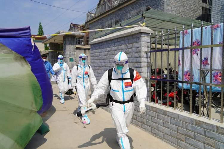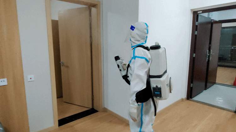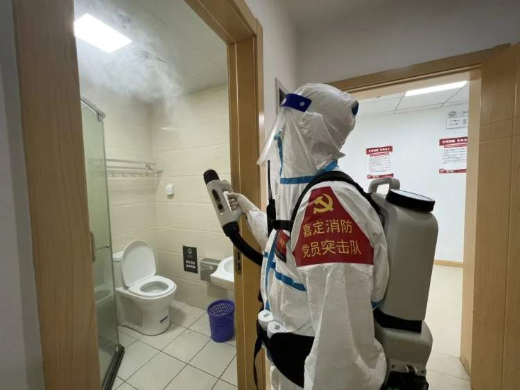 5月3日,覃敢率队来到了星火村,那里等待着他们的是1.5平方公里、1400余个房间的消杀任务。覃敢同志作为指挥员,第一时间明确各小组职责分工,确保队伍快速高效运行。携带着人均60斤的器械,他们一遍一遍在楼宇中穿梭。全屋喷洒药剂、喷湿被褥床单、打包消杀垃圾、擦拭全部表面、再次彻底消毒,一次次弯腰、一次次起立,一系列正规严谨的消杀流程下来,仅一个房间就要耗时20分钟以上,队员们穿着密不透风的防护服,额头、脸上被勒出了深深的印痕,双手被手套捂的满是褶皱,身上的衣服被汗水浸泡的湿了又干,干了又湿…..