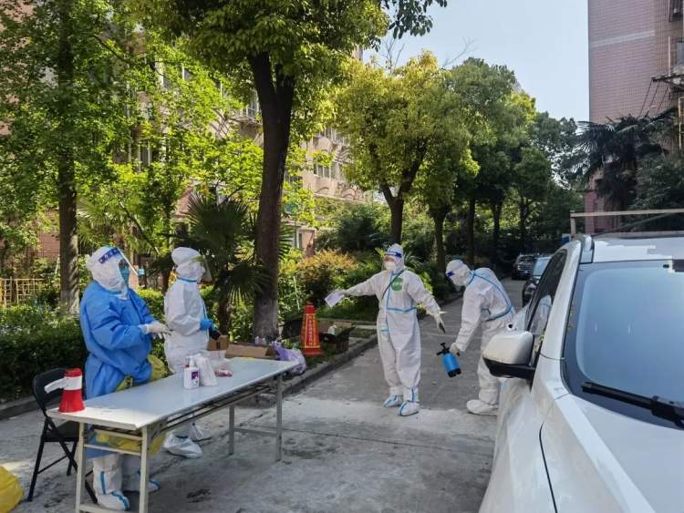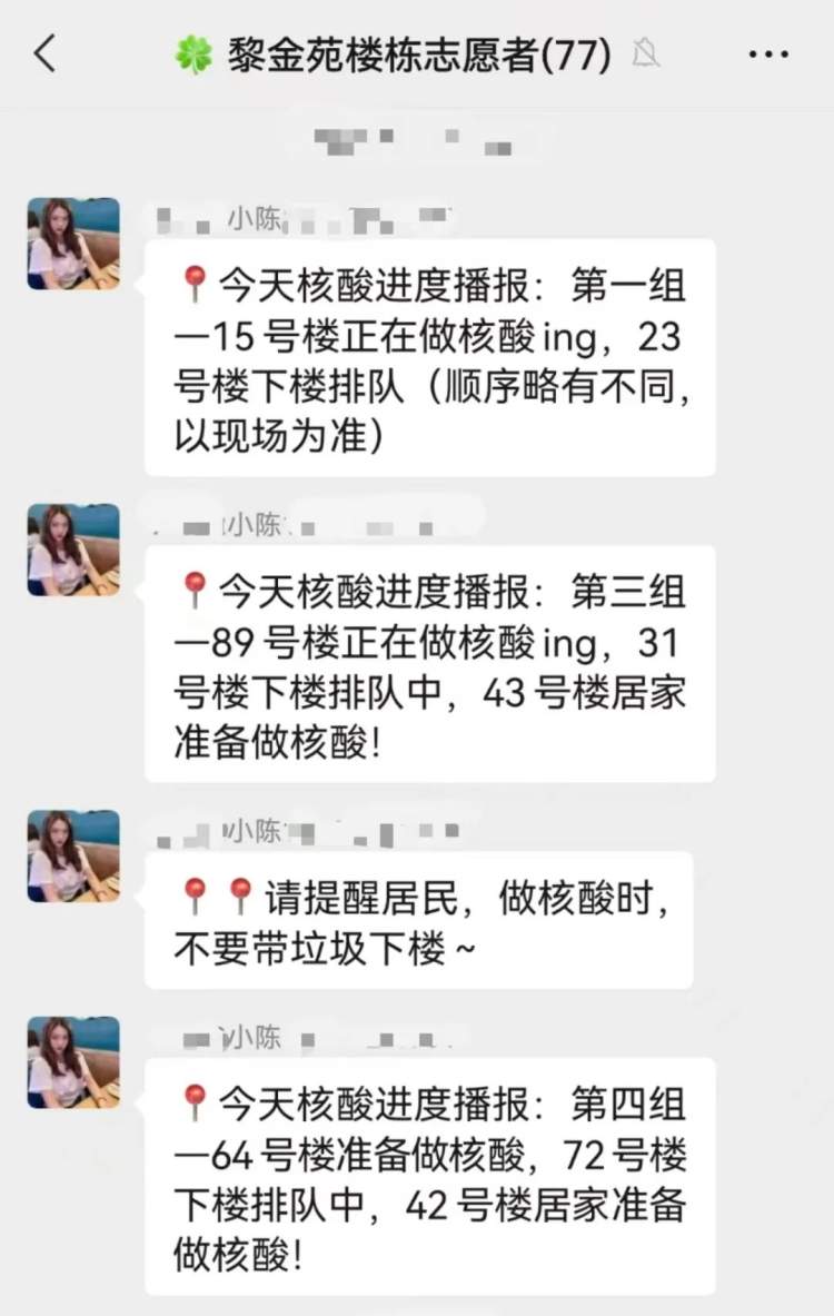 张鹏宇介绍:“线上负责的老师会逐栋通知楼组长,一楼核酸,一楼等待,一楼核酸结束,下一楼组立马行动。为避免路径交叉,先后核酸的两栋楼不能是同一排,比如第一排的1号楼先做,结束以后,17号楼下来再做,这样两楼居民互不碰面。”同时,引导、通知居民核酸检测的志愿者在随居民来回的途中会将经过路径消杀。