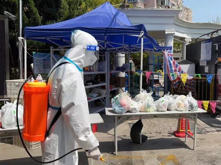物资发放辐射整个小区,一不小心,就会造成感染。黎金苑志愿者突击队从三个方面着手阻断病毒传播链:首先,所有志愿者上岗前需持有48小时核酸检测阴性报告、抗原自测阴性证明;其次,设置大门、楼栋两道物资消杀防线,“户外志愿者”“楼栋志愿者”分别进行一次消杀;最后,整个配送过程“户外志愿者”配送至楼栋下,与“楼栋志愿者”保持无接触。
