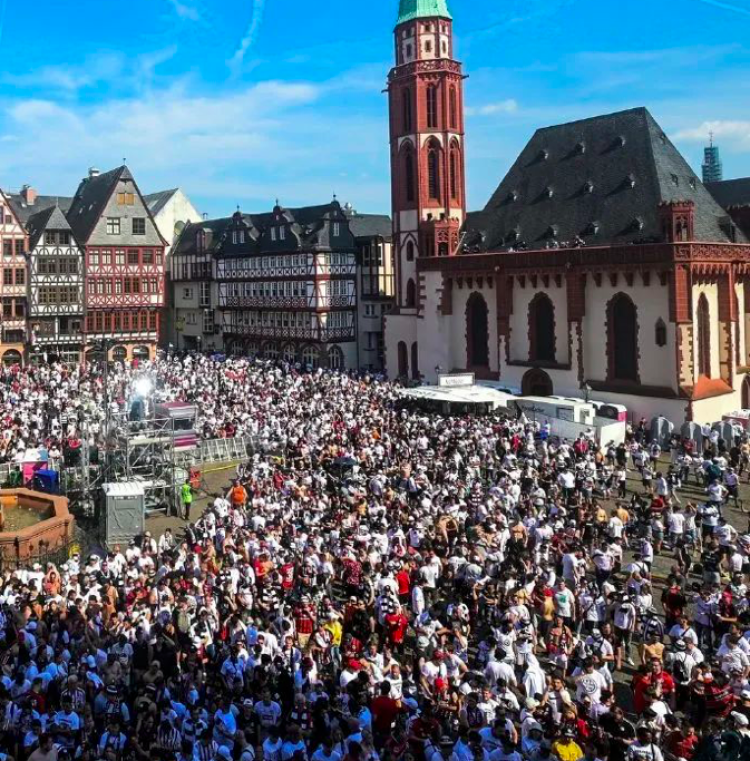 赛后,法兰克福开启全城狂欢模式,数万名球迷聚集在当地广场,庆祝球队夺冠。
