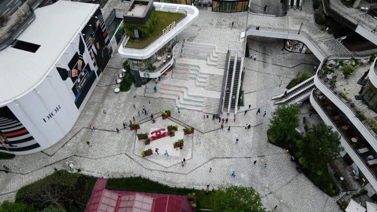 顾客进入后,一眼便会注意到曾经的网红景点中央广场及一旁阶梯与以往有所不同,考虑到疫情防控的需要,太古里所有餐饮店铺不能堂吃,取而代之的是室外的三个临时就餐点,其中之一便是广场旁的阶梯,地贴星星点点装饰在台阶上,既方便就座又不失美观。