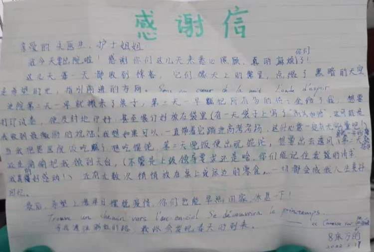 “病人作为高三毕业班的学生,正是奋斗拼搏最紧要的关头,这个时候感染新冠,对身心都有很大冲击。我们虽然只是照顾她短短的几天时间,但希望能尽我们最大的努力,让她接受专业治疗的同时,能够有尽量安静的环境和充足的营养,把疫情对她备考的影响降至最低。”经过数天的精心照料,方方终于达到了出院标准,朱医生和医疗队员们也都发自内心地为她高兴。出院当天,方方将亲笔书写的感谢信交到护士长吴程程手中:“如果可以,真想带着你们帮我打印的试卷踏进考场,它们包含了你们的祝福和鼓励,一定有无穷的力量!”