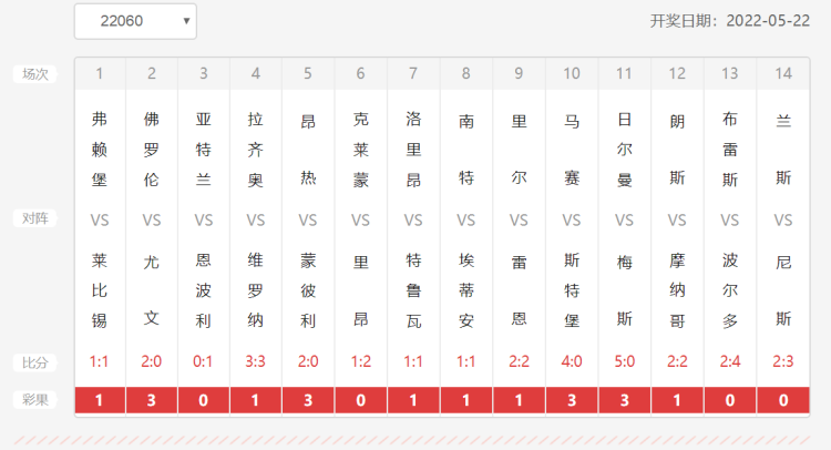 5月22日,胜负彩第22060期开奖结果出炉,全国中出2注一等奖,单注奖金500万元。