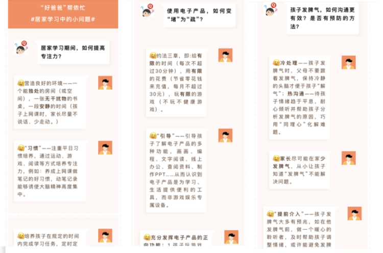 由于疫情影响,该校所有的活动均在线上进行,互动充分,反响热烈。三堂短小精悍的微课,一场精彩纷呈的学法沙龙,一个“集好爸爸育儿智慧”的公众号新版块……引领全体家长形成正向的家校合作意识,致力于实现家长的自主成长。