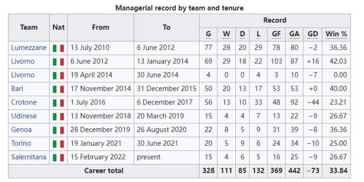 2020-2021赛季中途上任(2021年1月19日)都灵,上任前,都灵18场只拿到13分,上任后20场拿24分,最后以37分,第17名(倒数第四)保级;