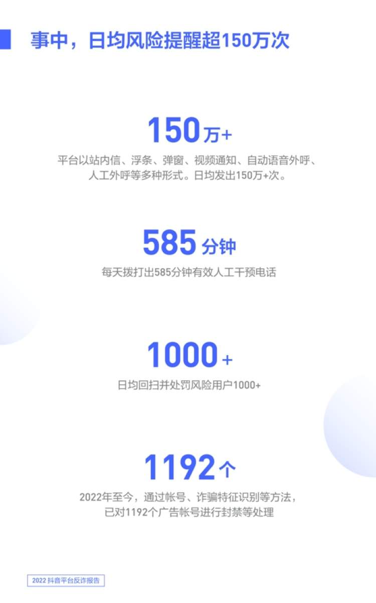 在线上,抖音今年推出了智能化功能抖音小安,为用户提供警告、核实、干预等反诈服务。目前,抖音小安每日可识别超过160万潜在风险帐号。