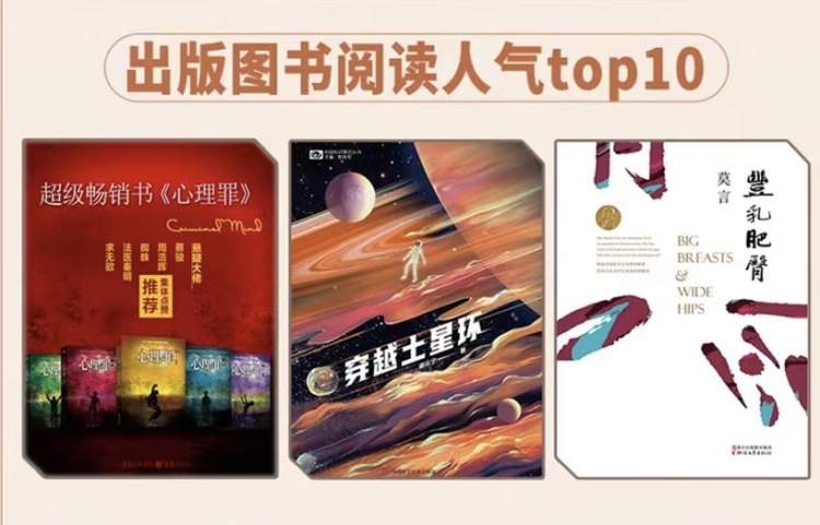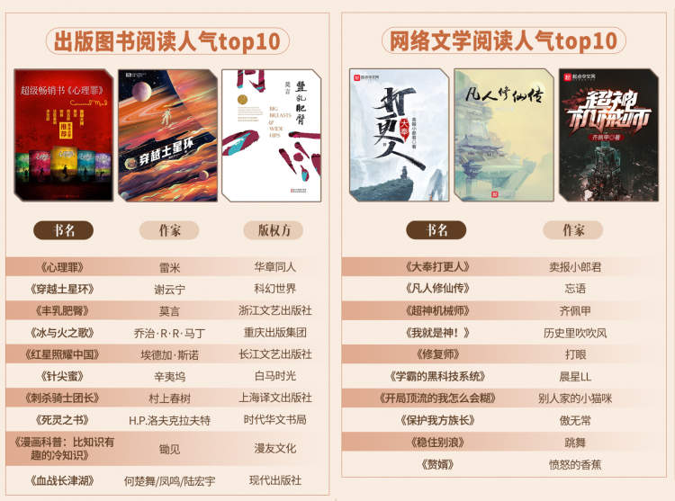 活动数据显示,出版读物的热门Top10包括了推理小说、经典名作和现实主义等类型,其中有雷米的经典悬疑推理小说《心理罪》、第32届中国科幻银河奖获奖作品《穿越土星环》、诺贝尔文学奖获奖作家莫言的《丰乳肥臀》、美国作家乔治·R·R·马丁所著的严肃奇幻小说系列《冰与火之歌》等。