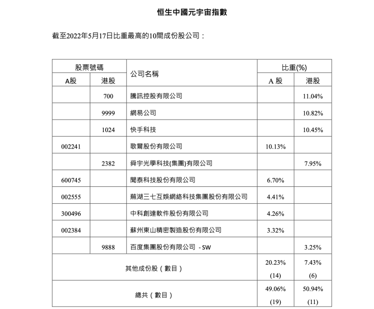 恒指公司在公告中称,“元宇宙”概念近期引起全球关注并成为新投资主题,“恒生中国元宇宙指数”趁势推出,旨在反映涉及与“元宇宙”相关业务、价值链及发展的中国内地公司之表现。