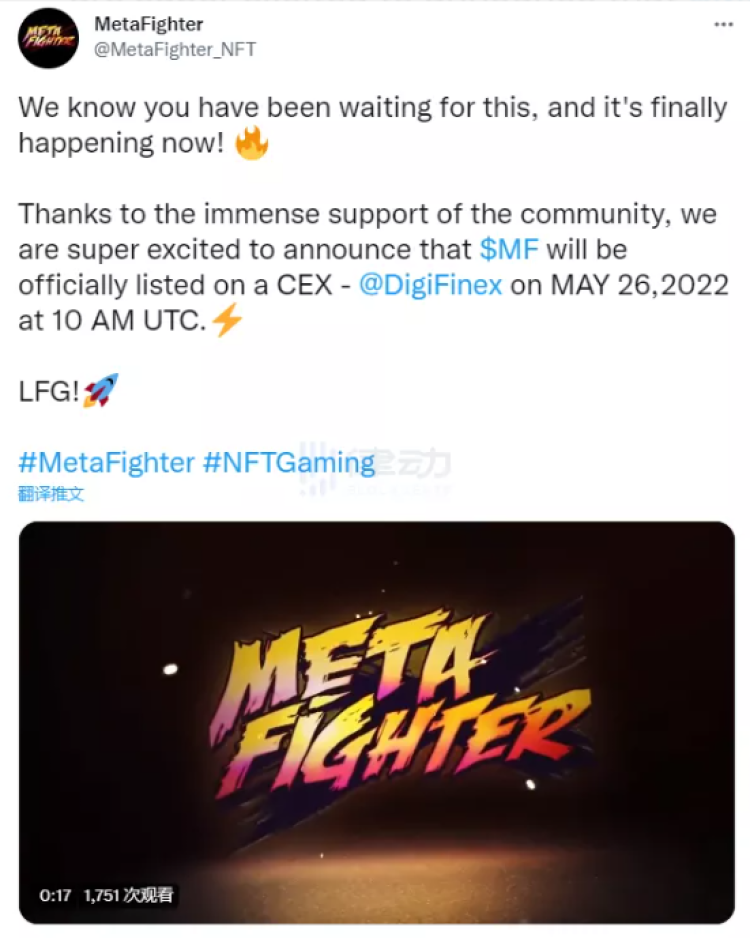 5 月 23 日,格斗元宇宙游戏 MetaFighter 在其社交网站宣布,其游戏 Token MF 将于北京时间 5 月 26 日 18 时上线加密资产交易平台 DigiFinex。