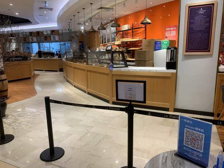 对面的巴黎蜜语倒是可以点单,门店入口被小桌子和隔离带拦着,“请扫码点单”的字样下是个葵花码,支持外卖配送和线下自提。