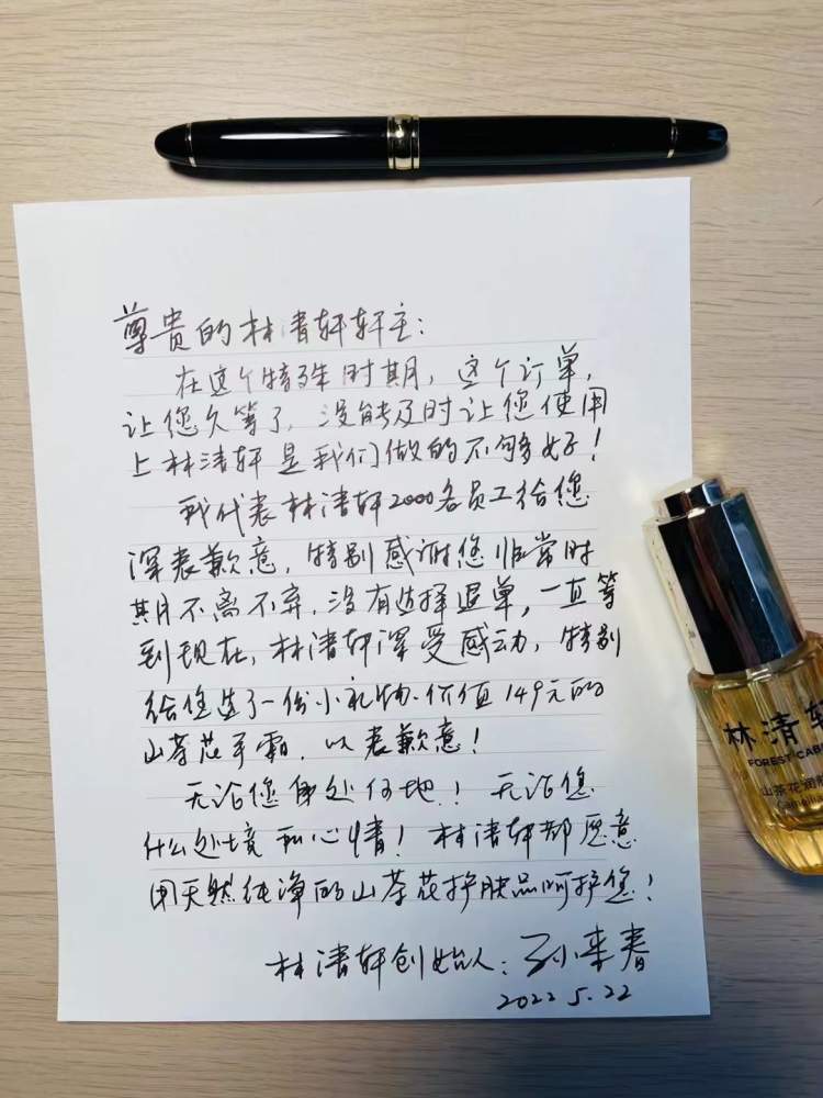 日前,上海有1470笔林清轩线上订单的顾客,在520前收到了他们的林清轩货品。当顾客们打开货品时,一张林清轩创始人孙来春手写的感谢信,跳入大家的眼帘:“感谢大家在非常时期的不离不弃,没有选择退单,一直等到现在,让林清轩深受感动。”为了表示感谢,林清轩还给每位顾客赠送了一份149元的山茶花护手霜。