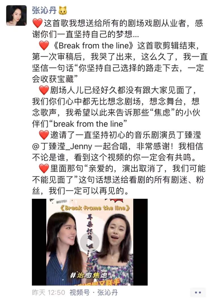 5月23日,张沁丹在她的各个社交媒体账号上发布了她和音乐剧演员丁臻滢翻唱《Break from the line》的视频。这是一首关于逐梦的歌曲,张沁丹还专门根据歌词精心设计了视频来表达自己的感受,歌里唱道: