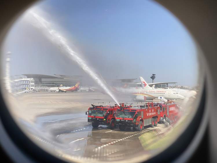 当他执飞的飞机滑平安降落的时候,当地还专门安排了‘水门仪式’,以最高规格来迎接‘白衣战士’回家,这也令他十分动容。
